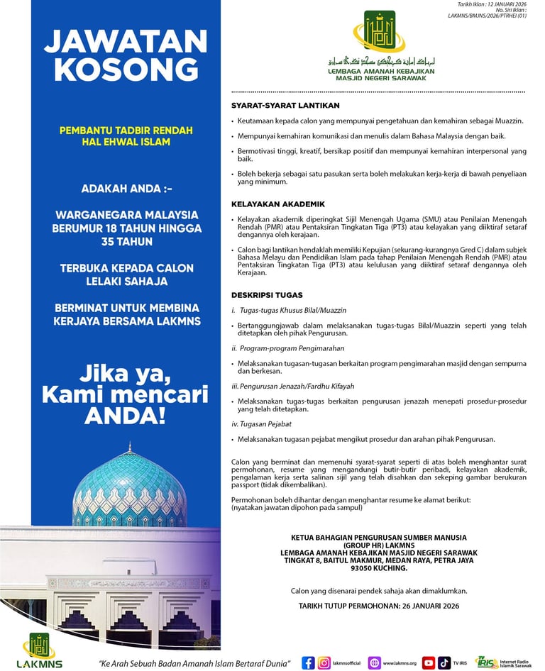Disclaimer: Lembaga Amanah Kebajikan Masjid Negeri Sarawak shall not be liable for any loss or damage caused by the usage of any information obtained from this website inclusive of using the Online Tools Translator for third language. Services provided through this website are subject to the terms and conditions of the respective service providers.